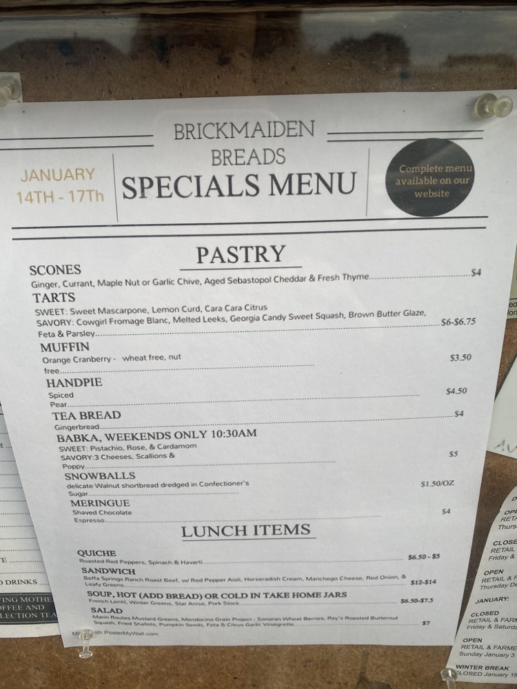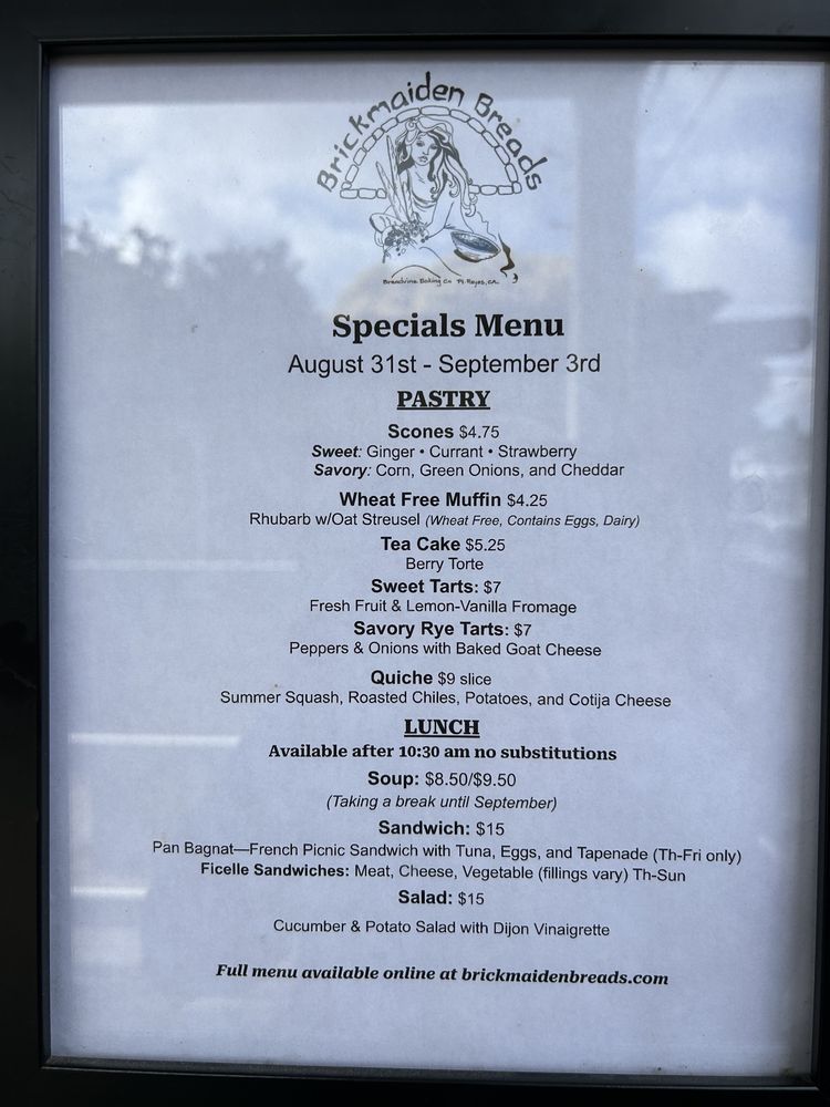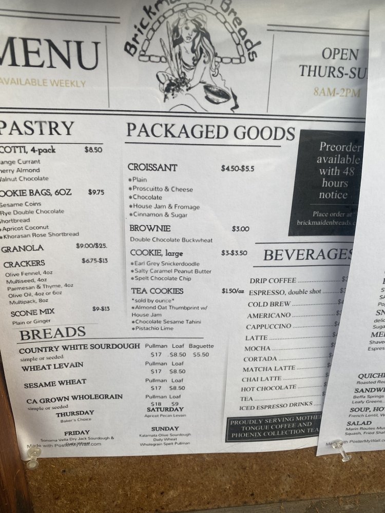 Welcome to Brickmaiden Breads, a delightful bakery located at 40 4th St, Point Reyes Station, CA. Known for their artisanal breads and pastries, Brickmaiden offers a culinary experience that blends tradition with innovation. Their menu is a beautifully crafted selection that includes classic Ficelle and Country White breads, alongside their sought-after Levain and Ca Wholegrain options.